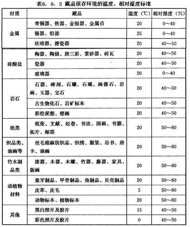 3、設(shè)置空氣調(diào)節(jié)設(shè)備的藏品庫(kù)房、展廳,其溫度和相對(duì)濕度應(yīng)保持穩(wěn)定,溫度日較差應(yīng)控制在2℃~5℃范圍,相對(duì)濕度日波動(dòng)值不應(yīng)高于5%,且應(yīng)根據(jù)藏品材質(zhì)類(lèi)別確定。藏品保存環(huán)境的溫度、相對(duì)濕度標(biāo)準(zhǔn)可按表6.0.3確定,并應(yīng)滿足工藝要求。
